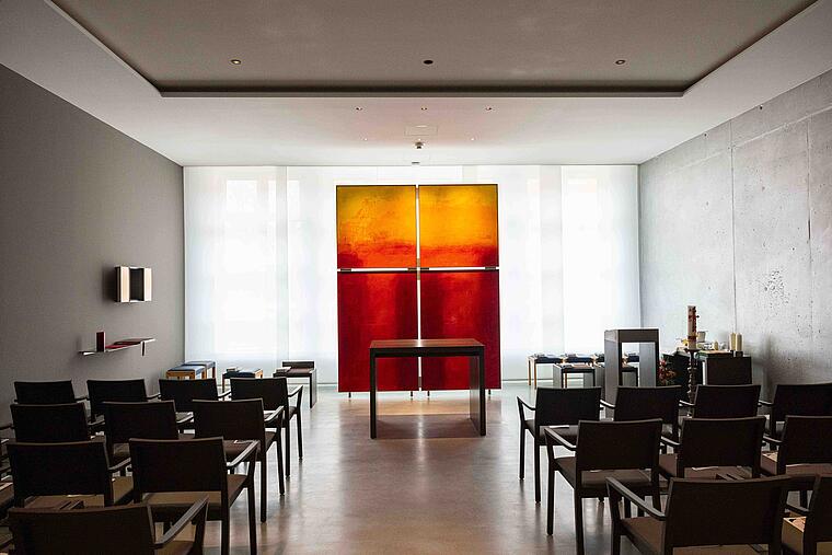 Die Kapelle ist ein großer, heller Raum. Boden und Wände sind sehr schlicht, reduziert und monochrom-grau gestaltet. Zentrales Element, das dem Raum Mitte, Haltung und Ausrichtung verleiht, ist das große freistehende Gemälde hinter dem Altar. Es dominiert mit seiner kräftigen Farbgebung, die von tiefem Violett über Rot bis in ein helles Gelb verläuft und als Kreuzfuge ausgebildet ist. Es geht um die Perspektive unzerstörbaren Lebens, das durch die Auferstehung Jesu erschlossen wurde – durch das Kreuz hindurch.